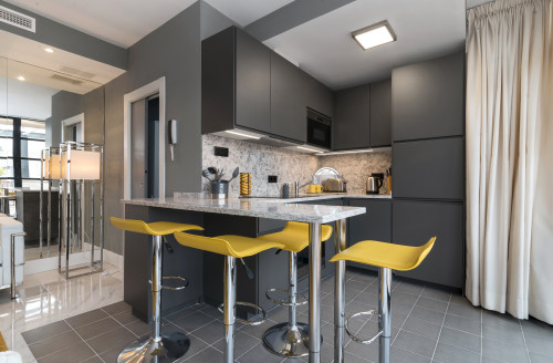 What a modern kitchen with dark gray cabinetry and a touch of a yellow with the bar chairs! The light gray marble touch as a countertop and full backsplash is a great idea to give some texture to space!
