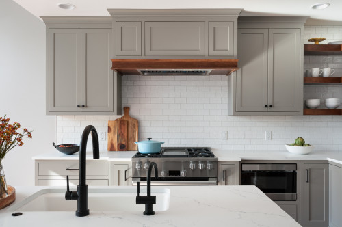 Love the wood detail on the hood that matches the breadboard! White subway kitchen backsplash and The black faucet and knobs are the great darker shades to brake a bit analogous gray tones of the kitchen!