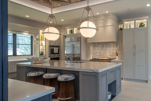The wall white cabinets and the gray backsplash tiles complement the island cabinets and the marble countertop! Again, the glass lighting fixtures are always a great idea combining with shiny ceramics!
